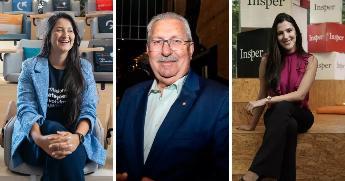 Montagem com três executivos da Invest Tech. À esquerda, Viviane Radiuk está em pé, sorrindo, com os braços cruzados; ela tem cabelos loiros e veste blazer preto com blusa branca. Ao centro, Felipe Zaghen está sentado em uma mesa de escritório, com um caderno azul à frente, usando camisa listrada e óculos, com vista para prédios ao fundo. À direita, Wagner Pinheiro sorri encostado em uma coluna de madeira, vestindo terno escuro com camisa clara, em ambiente corporativo iluminado. Fotos: Divulgação.