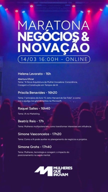 A iniciativa é liderada por Helena Levorato, CEO da Sociedade Brasileira de Inovação e fundadora do projeto Mulheres Que Inovam. Durante a maratona, participantes terão a oportunidade de acompanhar discussões e experiências de mulheres que se destacam em diferentes áreas do empreendedorismo.
